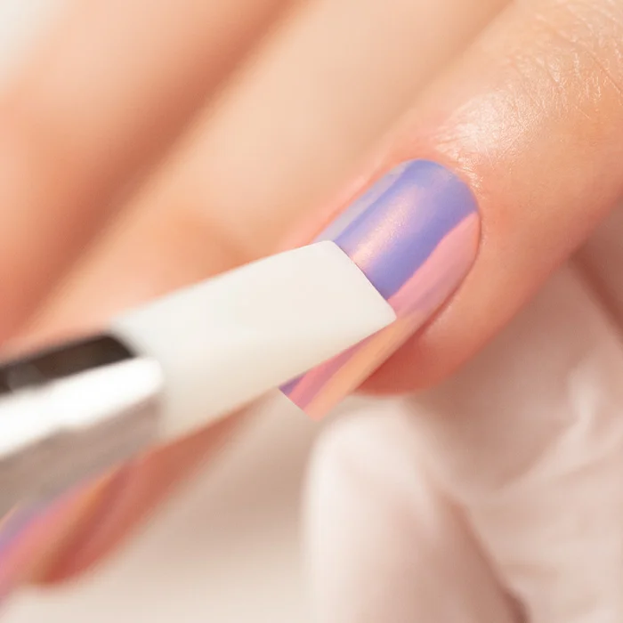 Ακολουθείτε κανονικά τα βήματα του ημιμόνιμου ή gel ή ακρυλικού, σφραγίζετε με top coat XΩΡΙΣ κολλώδη ουσία και αφού έχετε πολυμερίσει τοποθετείτε τη σκόνη με το ειδικό πινελάκι.