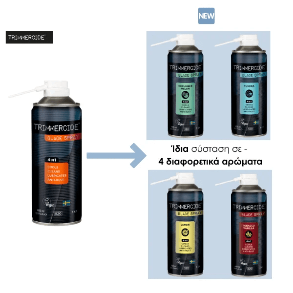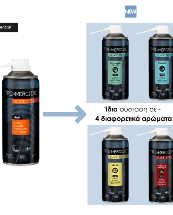 Το TRIMMERCIDE Blade Spray 4in1 είναι ένα επαγγελματικό σπρέι πολλαπλής δράσης, ειδικά σχεδιασμένο για την καθαριότητα, λίπανση, ψύξη και προστασία των κοπτικών λεπίδων κουρευτικών μηχανών, trimmers και clipper. Με μία μόνο εφαρμογή, απομακρύνει τα υπολείμματα τρίχας και σκόνης, μειώνει την υπερθέρμανση των λεπίδων και προλαμβάνει τη σκουριά, αυξάνοντας τη διάρκεια ζωής του εξοπλισμού.